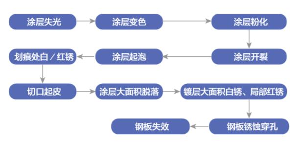 彩涂鋼板的失效過程如下圖所示,涂層失效、鍍層失效乃至鋼板穿孔是關鍵的腐蝕發(fā)生過程。因此提高涂鍍層厚度,且采用耐候、耐蝕涂鍍層是最有效的防止彩涂鋼板腐蝕失效的手段。