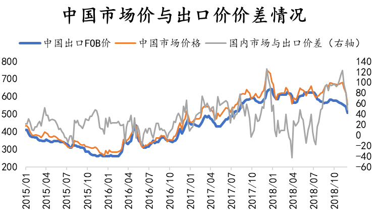首先在11月下旬中國FOB價格出現大幅的下跌,鋼廠接受海外訂單量增加,并且11月中旬重點鋼企粗鋼日均產量195.15萬噸。11月中旬重點鋼企粗鋼日均產量195.15萬噸,旬環比增加3.51萬噸,增長1.83%。截至11月中旬末,重點鋼鐵企業鋼材庫存量為1327.11萬噸,旬環比增加104.23萬噸,上升8.52%。從鋼企日均產量可以看出,目前鋼材產量還是在不斷上升中,決定目前鋼市價格的還是下游的終端需求,但目前市場供大于求的狀況未有改變,并且國內貿易商冬儲意向并不明顯,且部分地區出現停工現象,導致鋼廠出口意愿增加。另外中美貿易戰進入90天“停火期”,這也利好鋼材的出口增加。綜合來看,12月份出口量或接近600萬噸,同環比均會有所上漲。