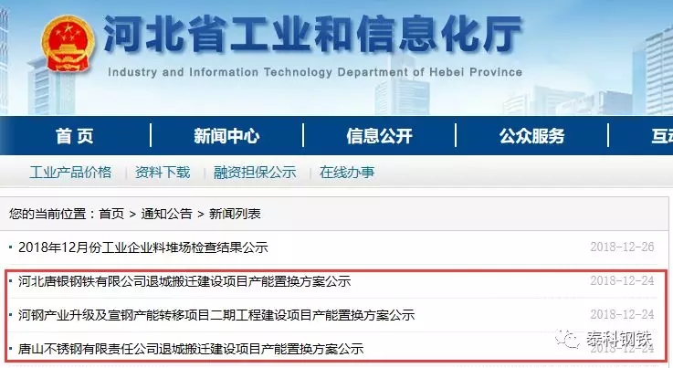 2018年12月24日,河北省工業與信息化廳連續公示了三個鋼鐵產能置換文件,分別為《河北唐銀鋼鐵有限公司退城搬遷建設項目產能置換方案公示》、《河鋼產業升級及宣鋼產能轉移項目二期工程建設項目產能置換方案公示》、《唐山不銹鋼有限責任公司退城搬遷建設項目產能置換方案公示》,文件綜合內容如下: