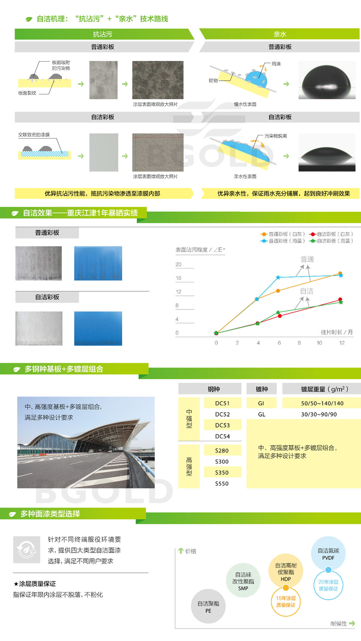 自潔彩板是一種新型的戶外建筑用彩涂鋼板。自清潔系列彩涂鋼板是寶 不同涂層體系的沾灰及可清潔性 普通聚酯體系:高的沾灰程度,不易清潔。 氟碳涂層:中低等的沾灰程度,具有很好的可清潔性。 寶鋼自潔板:中高的沾灰程度,易清潔。 |
